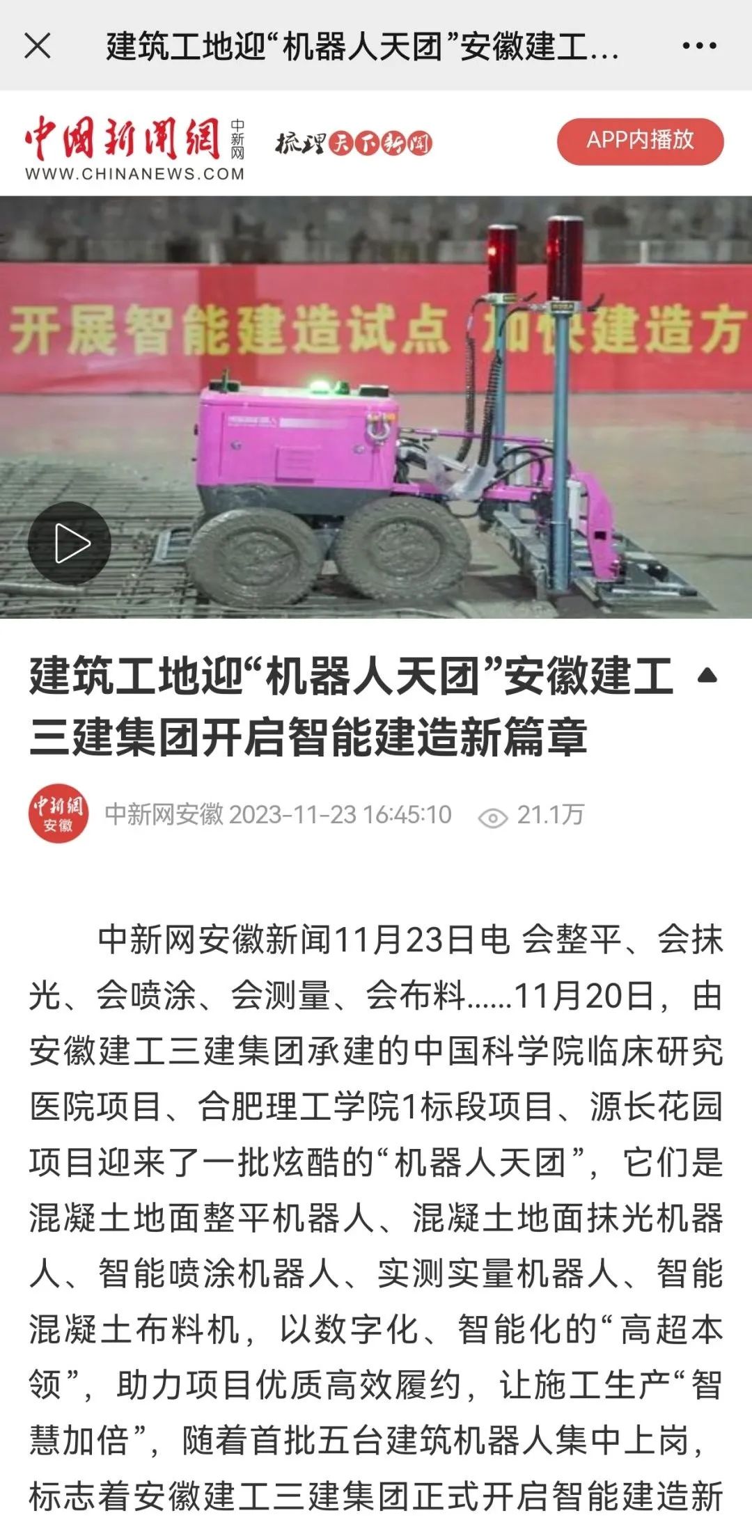 11月23日,中新網、安徽國資、合肥晚報以“建筑工地迎‘機器人天團’安徽建工三建集團開啟智能建造新篇章”為題,專題報道公司首批引進五臺建筑機器人助力項目高質量建設,開啟智能建造新篇章,受到廣泛關注。截至發稿時,閱讀量已超20萬次。