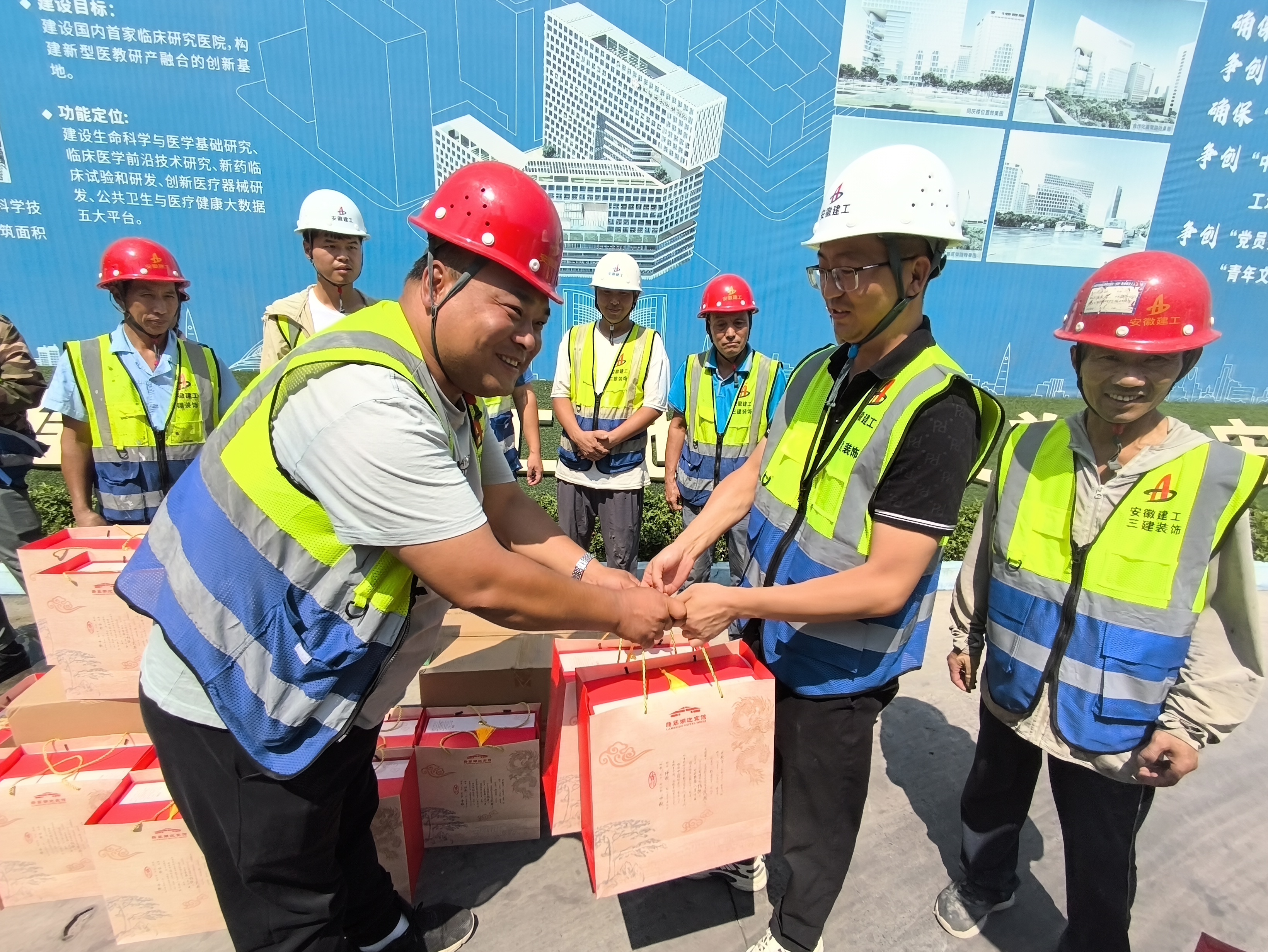 佳節“不打烊”,奮力“搶進度”。中科院項目建設者們搶抓工期,在這個闔家團圓的重要節日,主動放棄與家人團聚的機會,在項目上揮灑汗水、辛苦付出,為城市的現代化建設默默奉獻著。裝飾公司開展慶中秋慰問活動,為建筑工人們送上中秋月餅和中秋祝福。