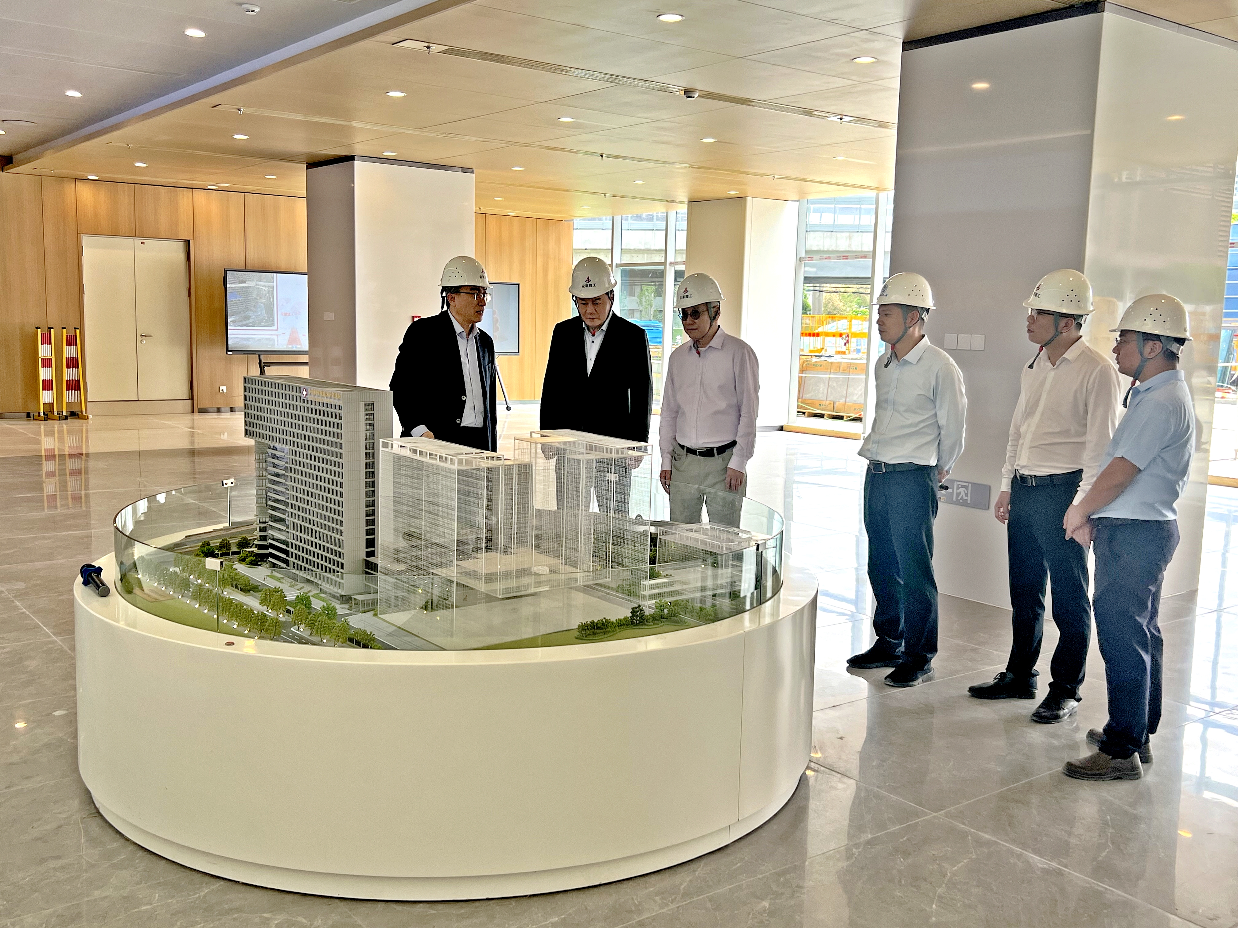 在項目現場,謝曉亮院士一行詳細聽取了工程進展、技術創新及質量管理情況的匯報,并實地考察了項目科研平臺、醫療功能區等重點施工區域,對我公司項目團隊高標準、高質量、高效率推進項目建設給予充分肯定。調研期間,薛天向謝曉亮院士介紹了醫院的整體規劃、科研布局及未來發展方向,同時,謝曉亮院士與各方代表圍繞“醫學研究平臺建設”和“產學研協同創新”展開深入交流。